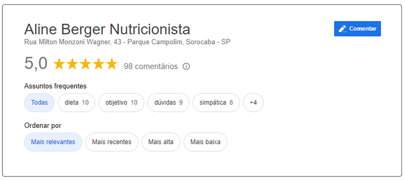 “Profissional atenciosa, simpática, esclarecedora, elaborou cardápio de acordo com minha rotina alimentar, estou satisfeita e me sentido muito bem”